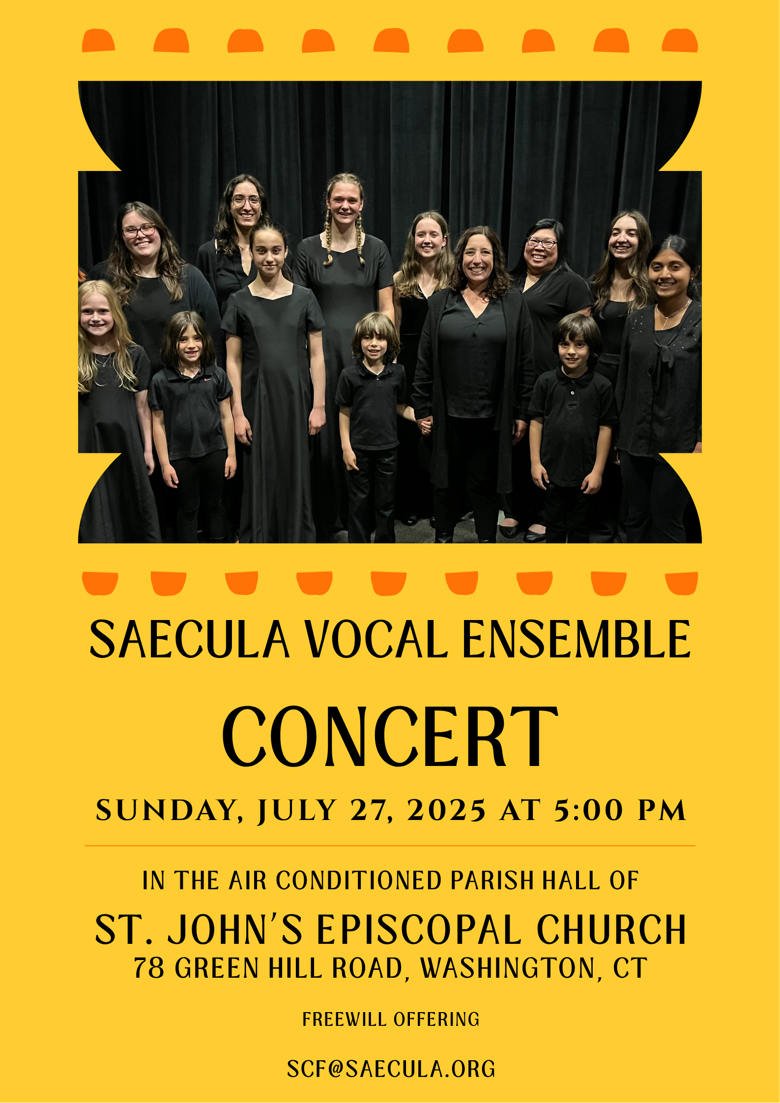 Saecula Vocal Ensemble performs a concert of eclectic choral music featuring Renaissance polyphony, gospel anthems, spirituals, folk songs, and contemporary works.